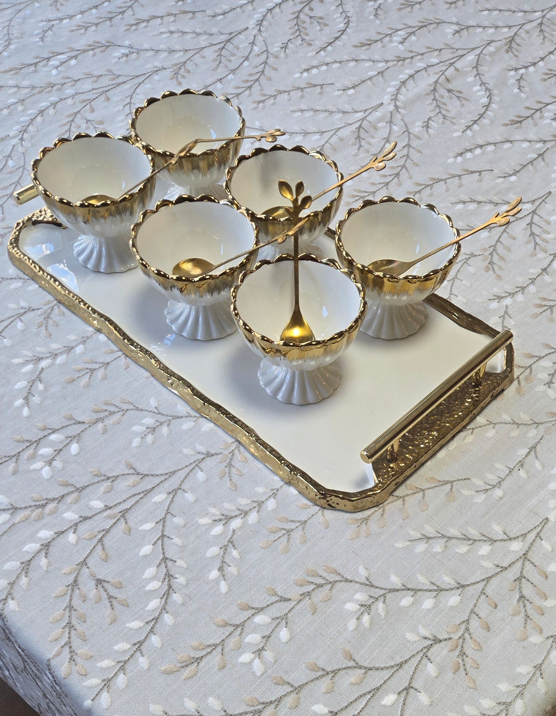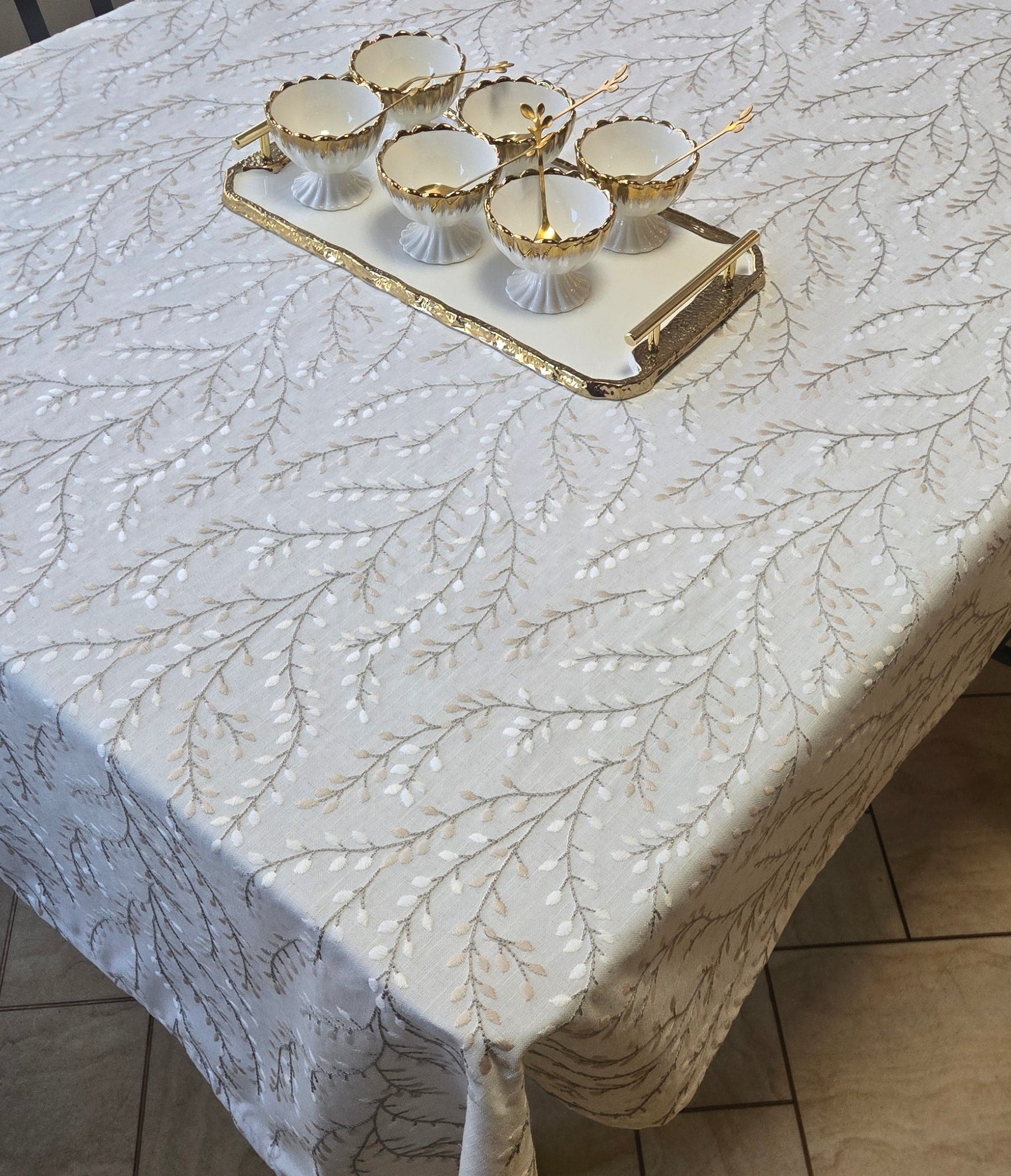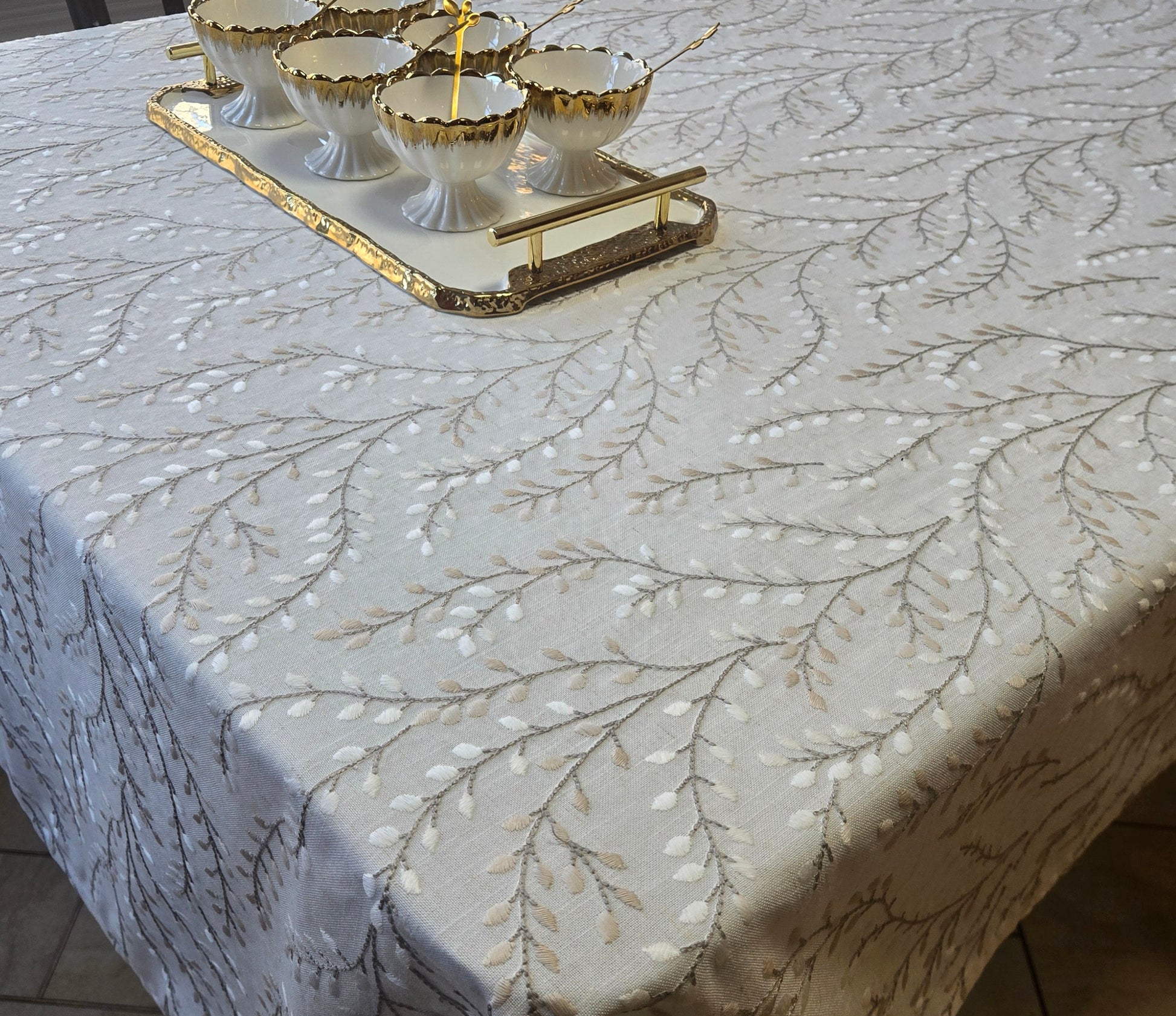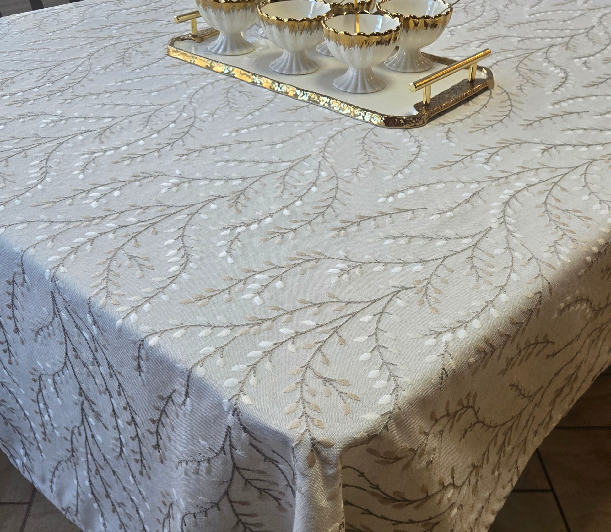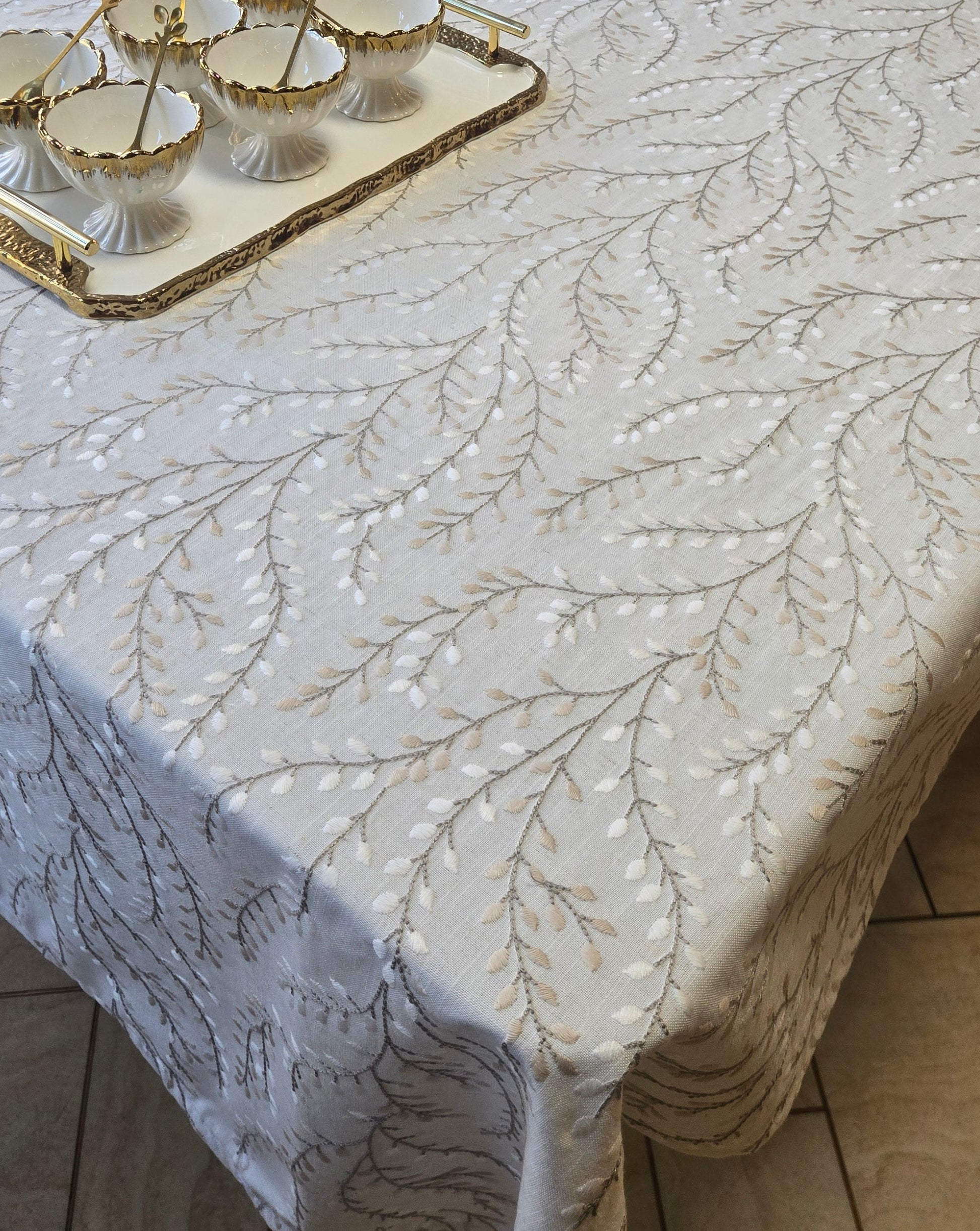 This next level embroidered soft linen cloth is breathtaking. Intricate taupe and cream leaf embroidery enhances the sophisticated style