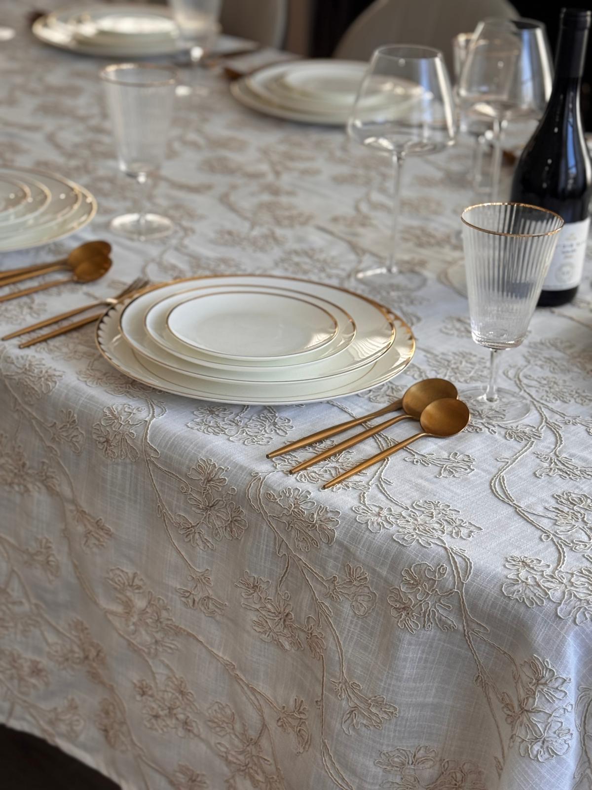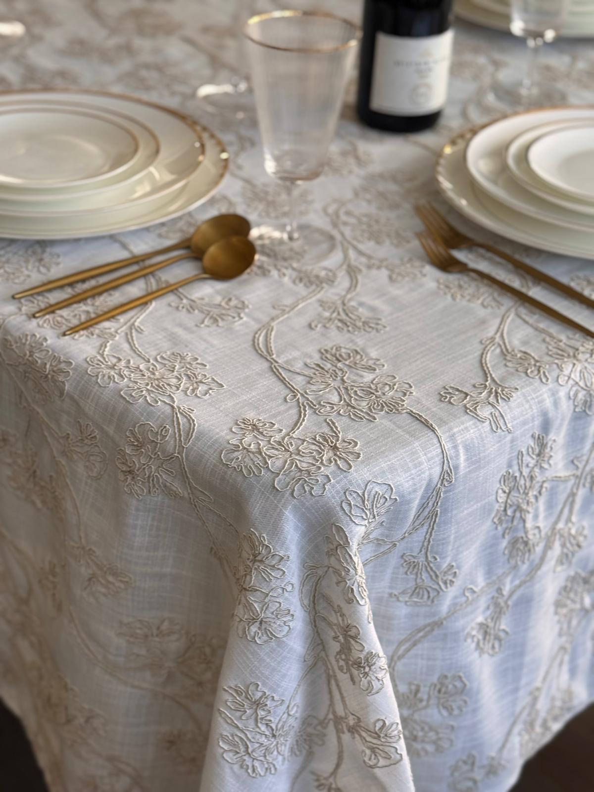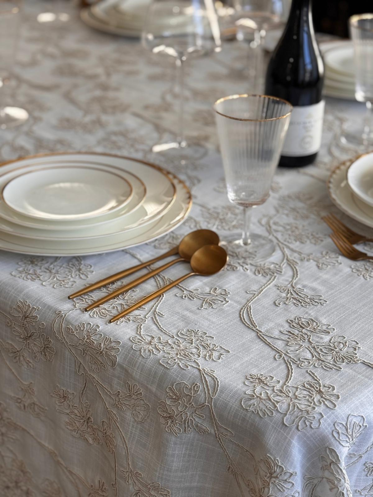 This next level embroidered soft linen cloth is breathtaking. Intricate floral taupe embroidery enhances the sophisticated style
