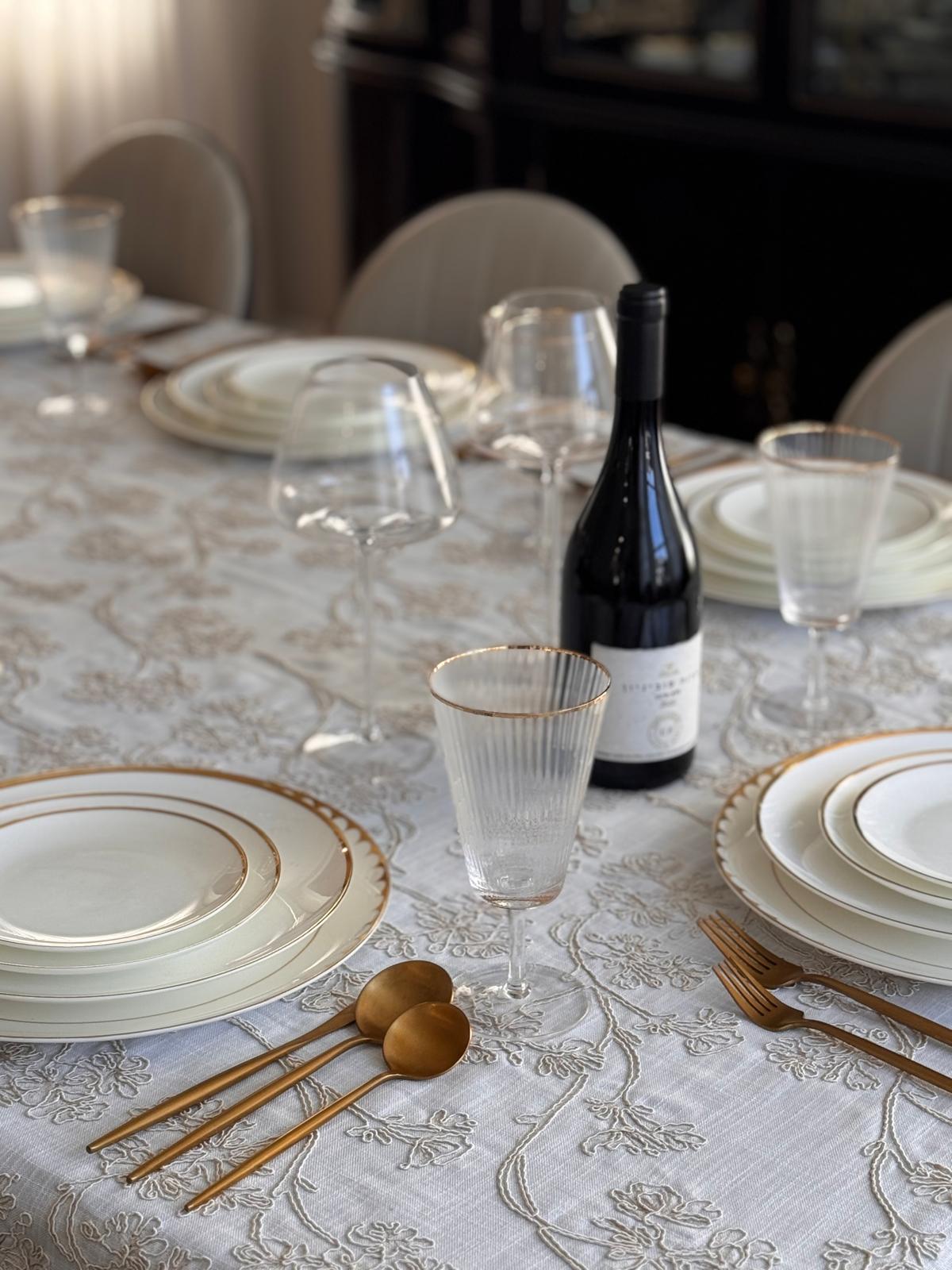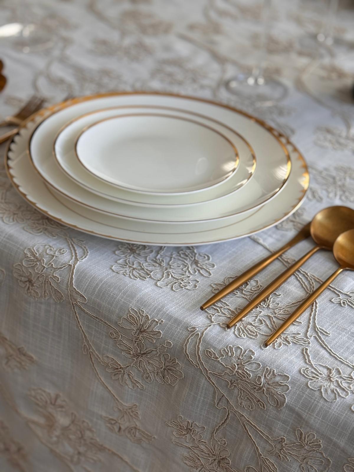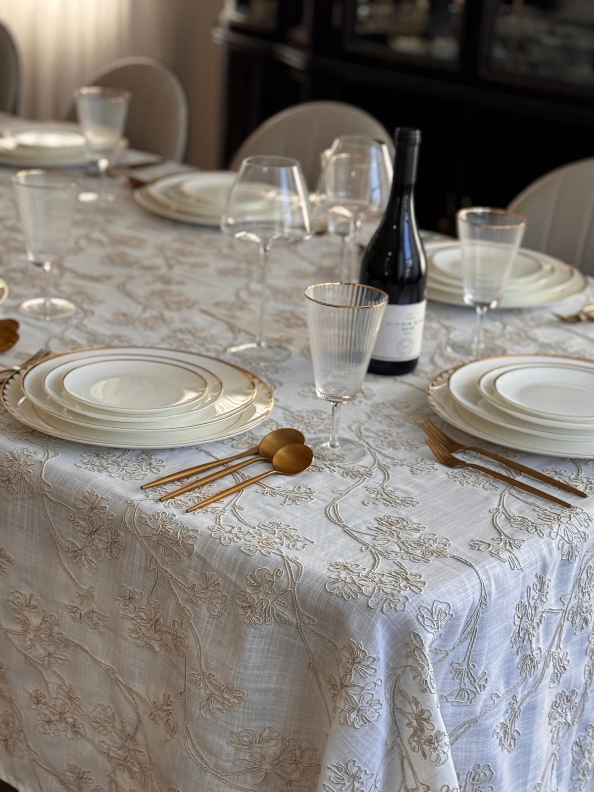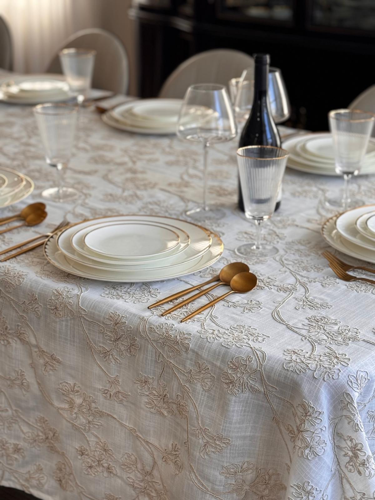 This next level embroidered soft linen cloth is breathtaking. Intricate floral taupe embroidery enhances the sophisticated style