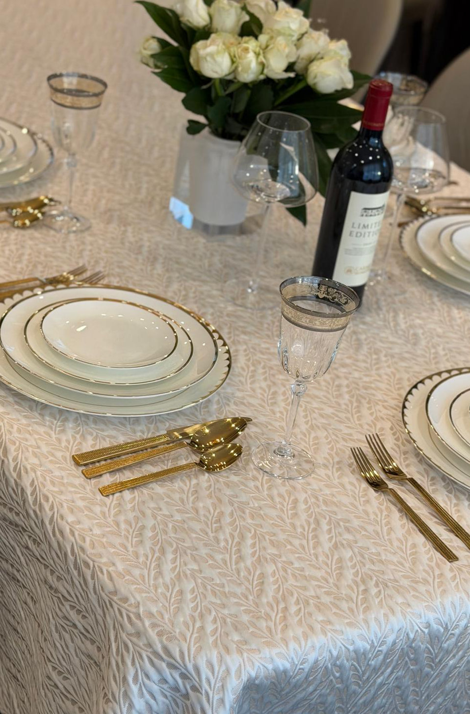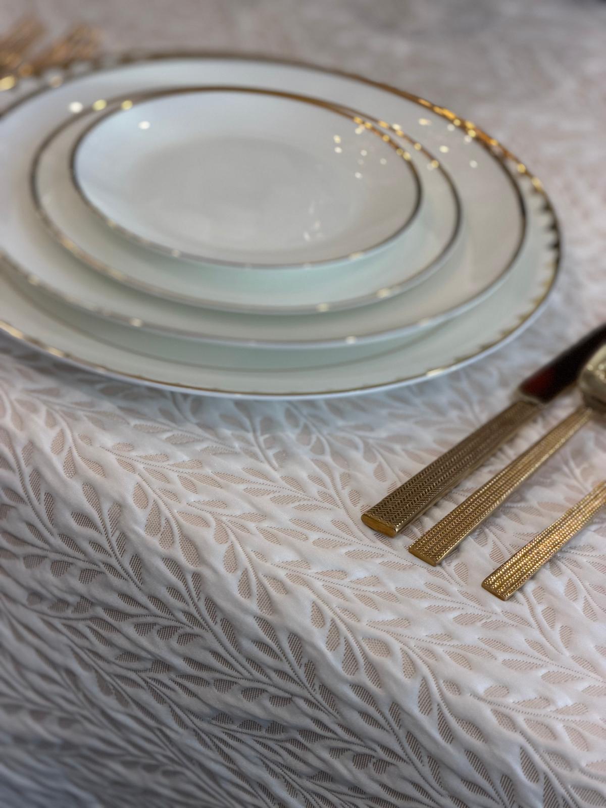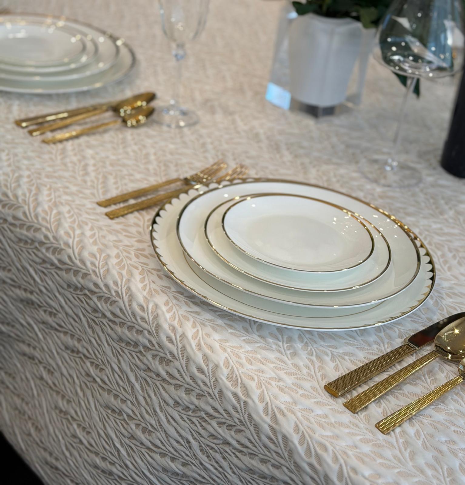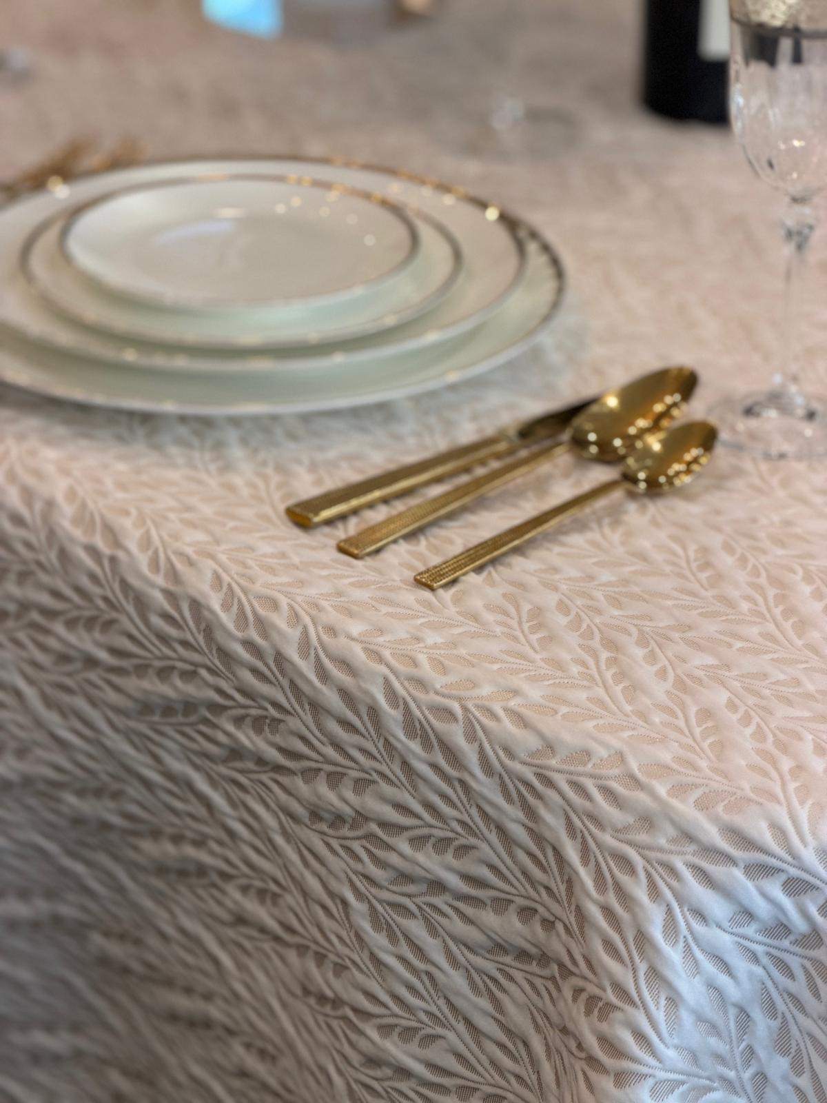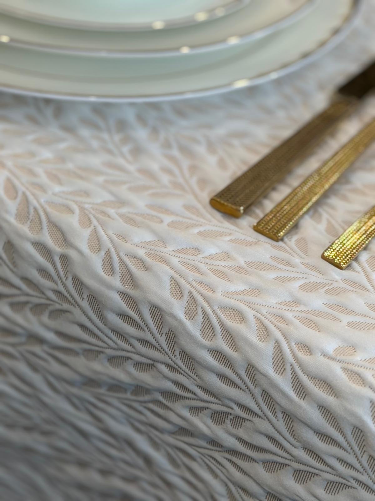 Softly raised and quilted, this cloth shimmers with a delicate gold sheen exuding sculpted elegance. Its tactile texture adds depth and a refined, luxurious presence to any table.