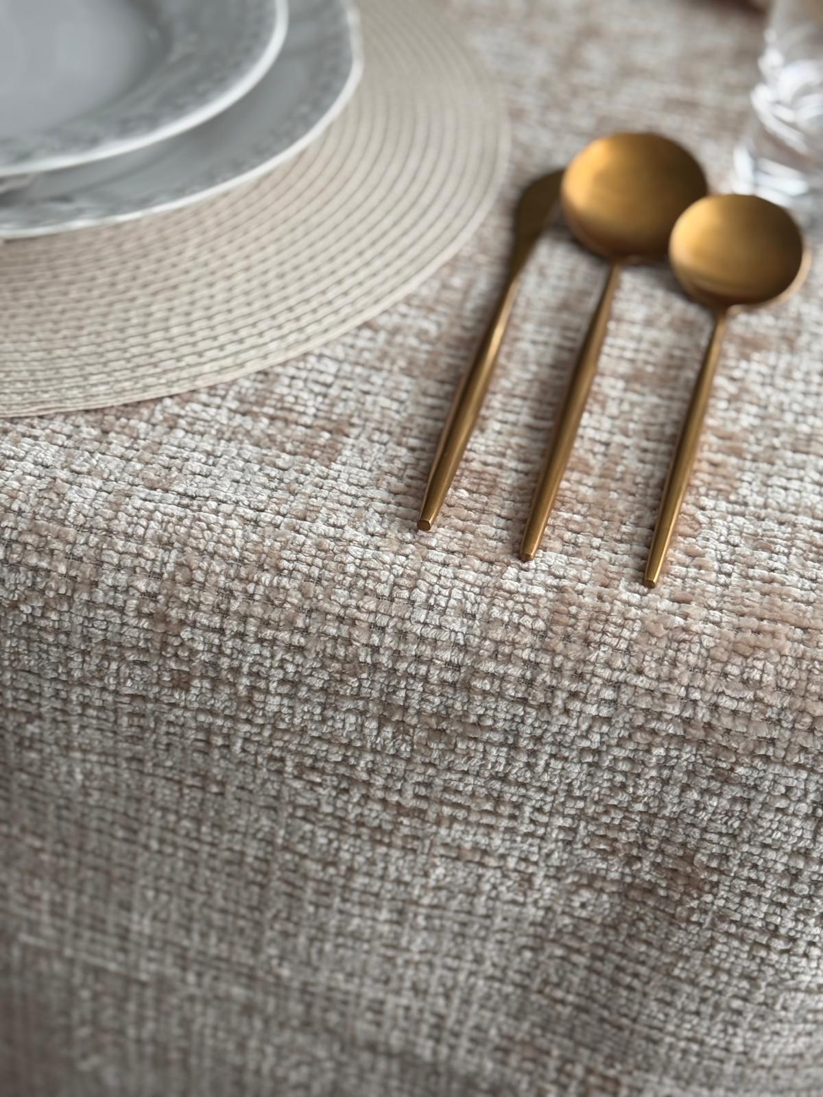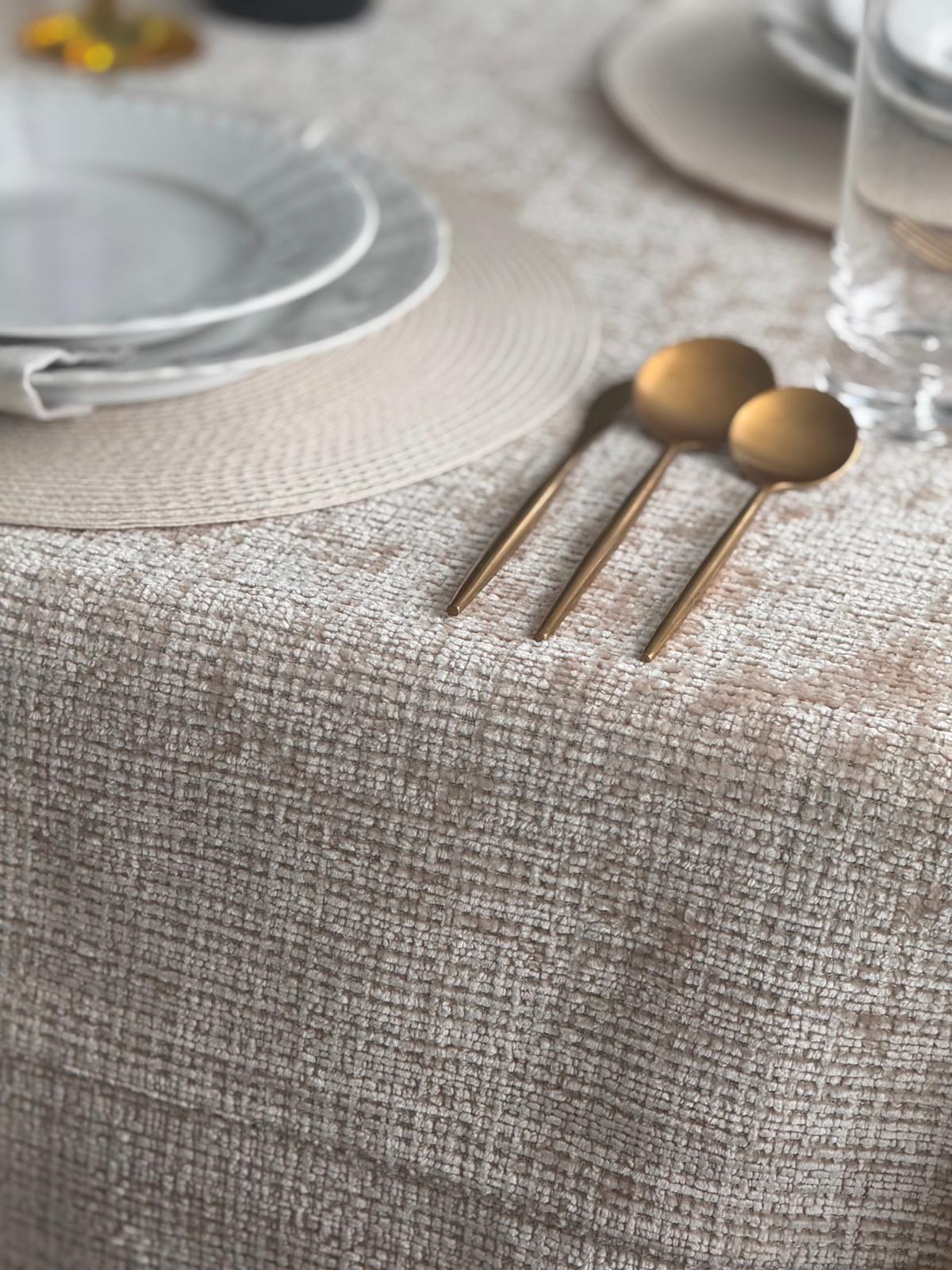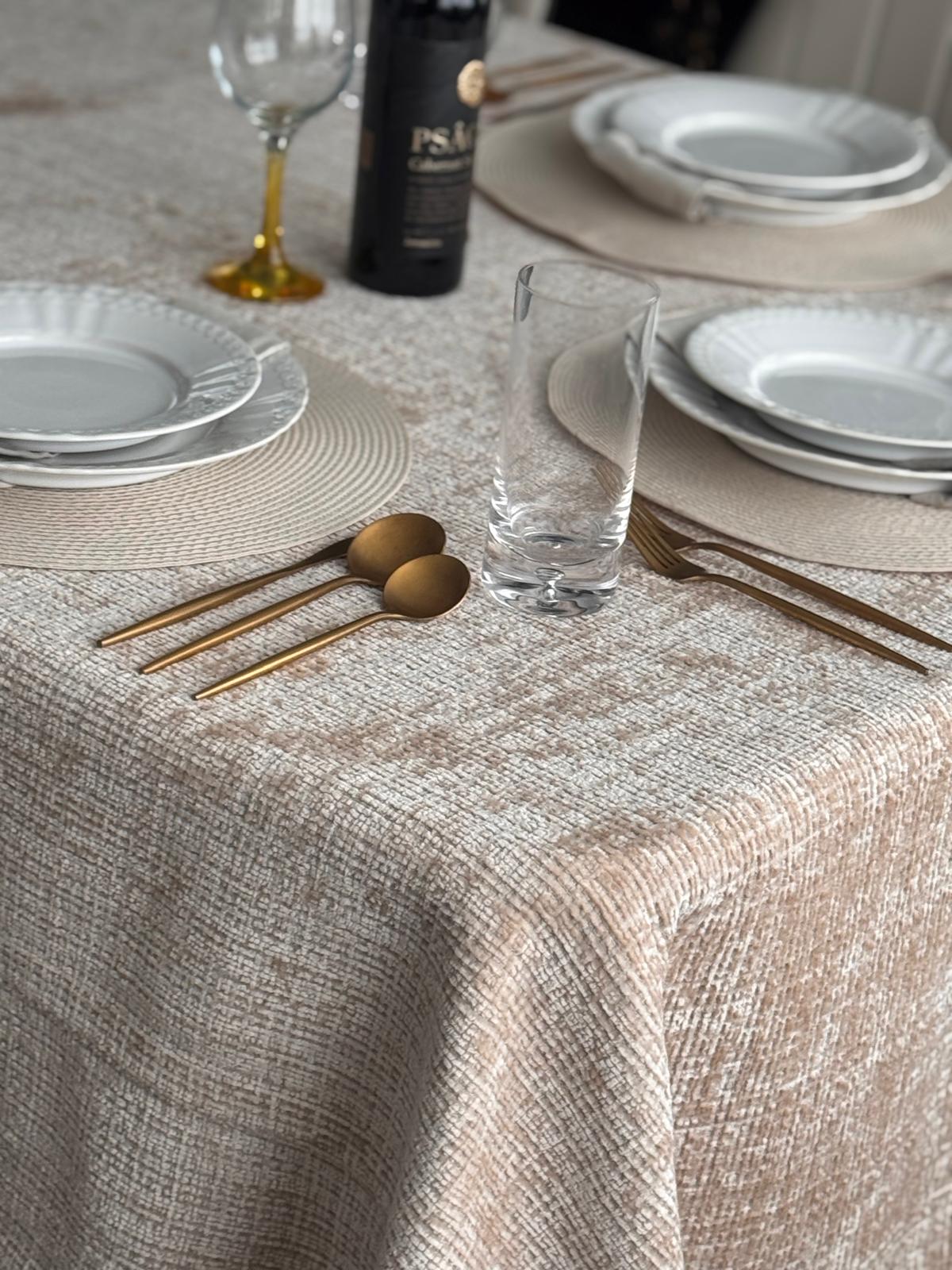 This modern textured light taupe and beige velvet chenille tablecloth is breathtaking.