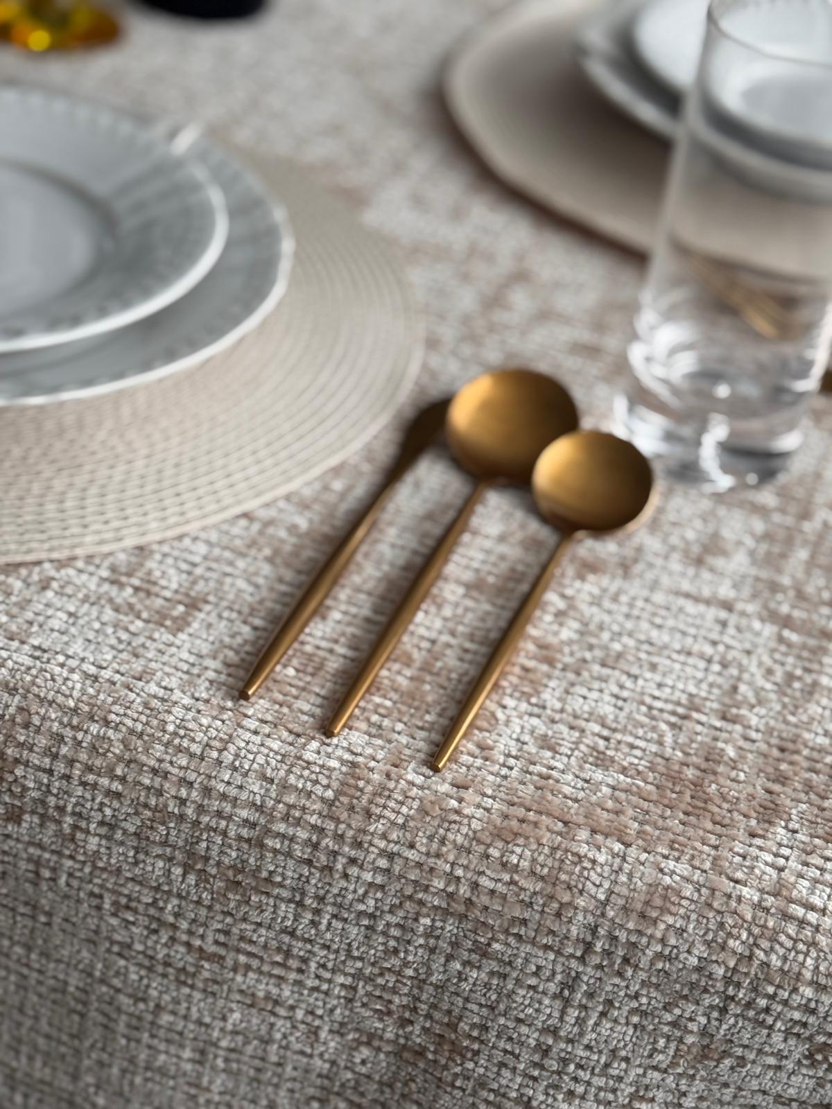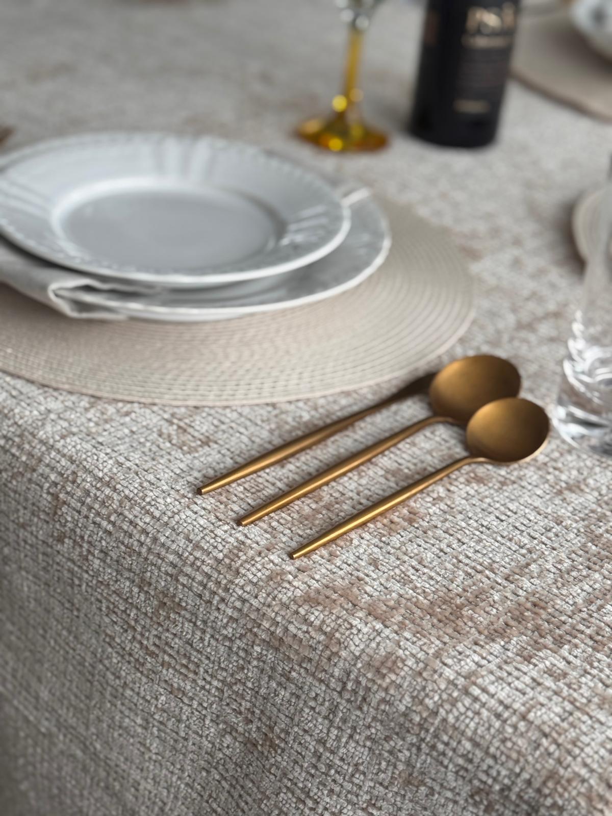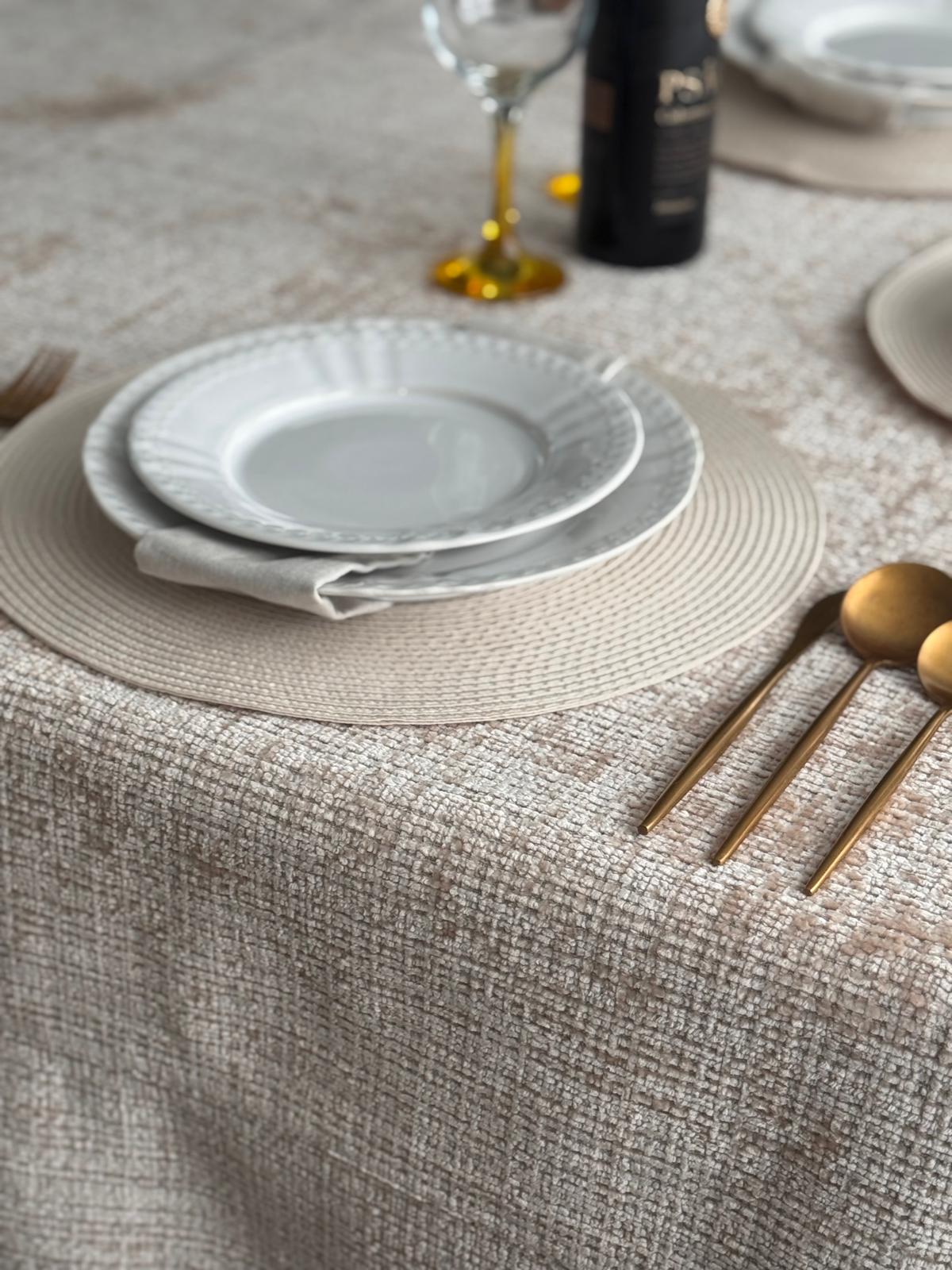 This modern textured light taupe and beige velvet chenille tablecloth is breathtaking.