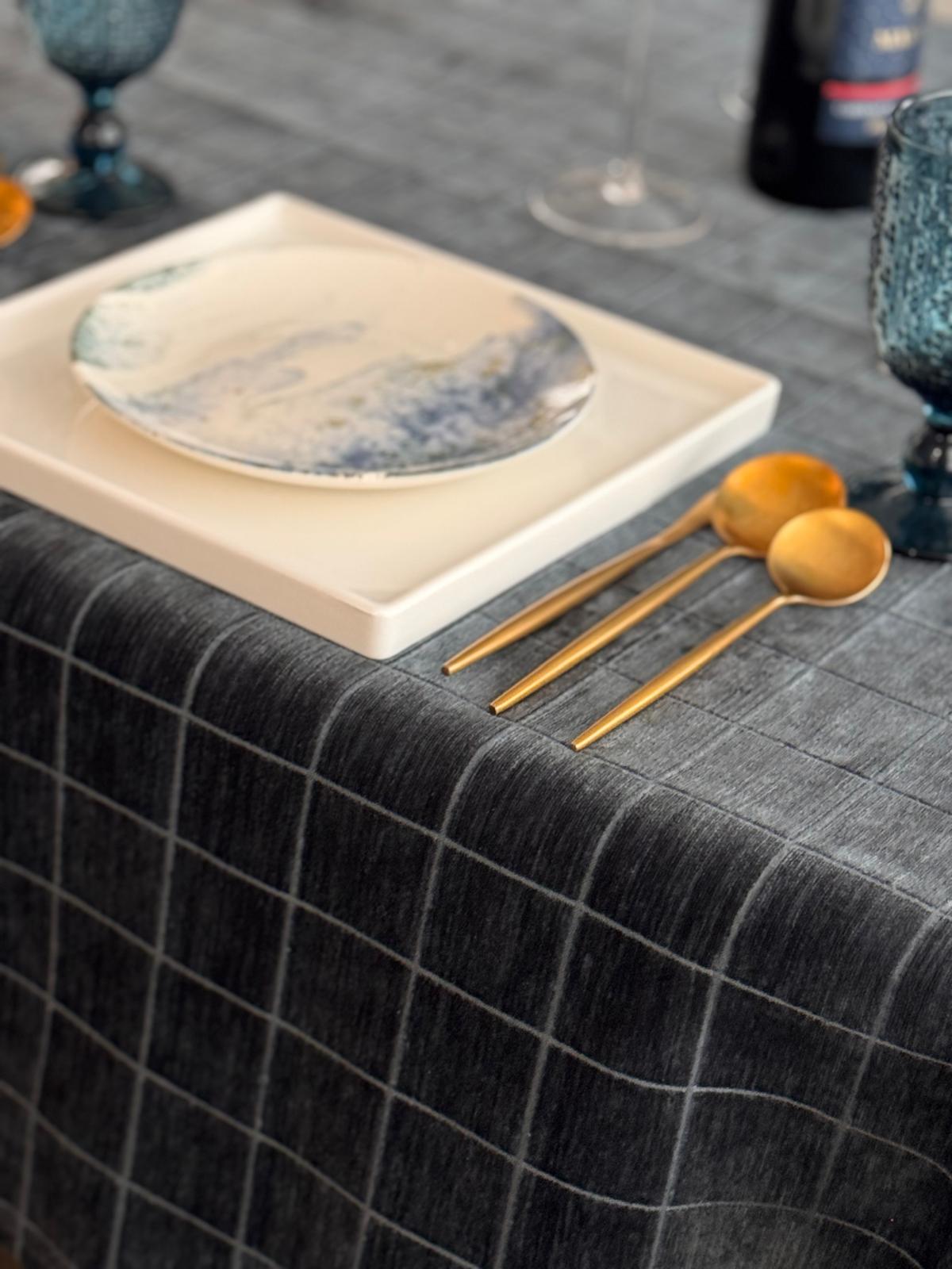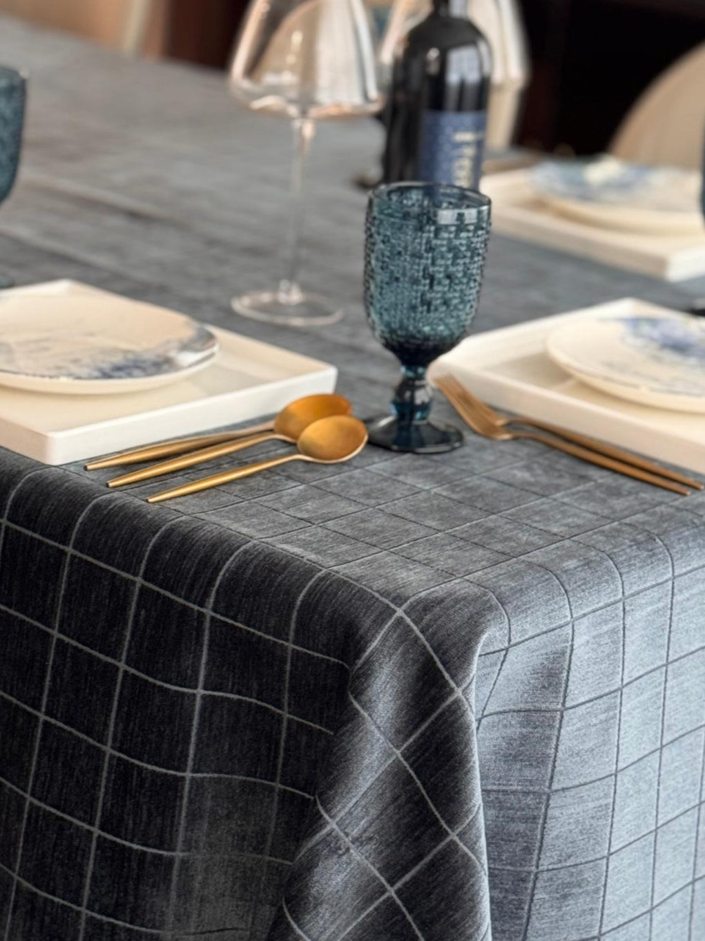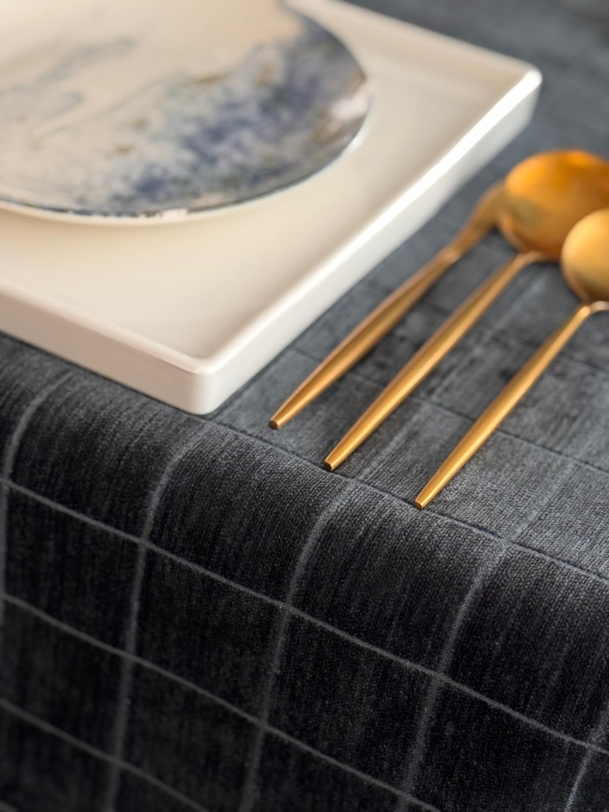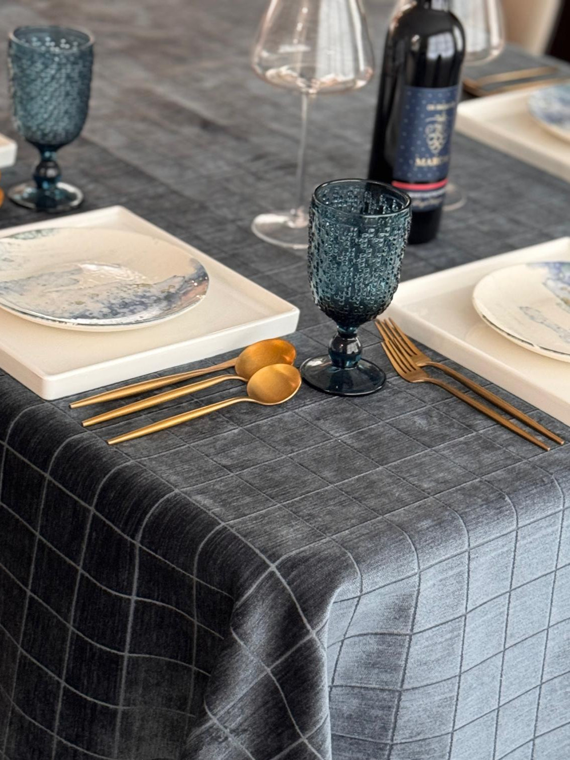 This modern square patterned velour tablecloth adds a touch of sophistication to any table setting