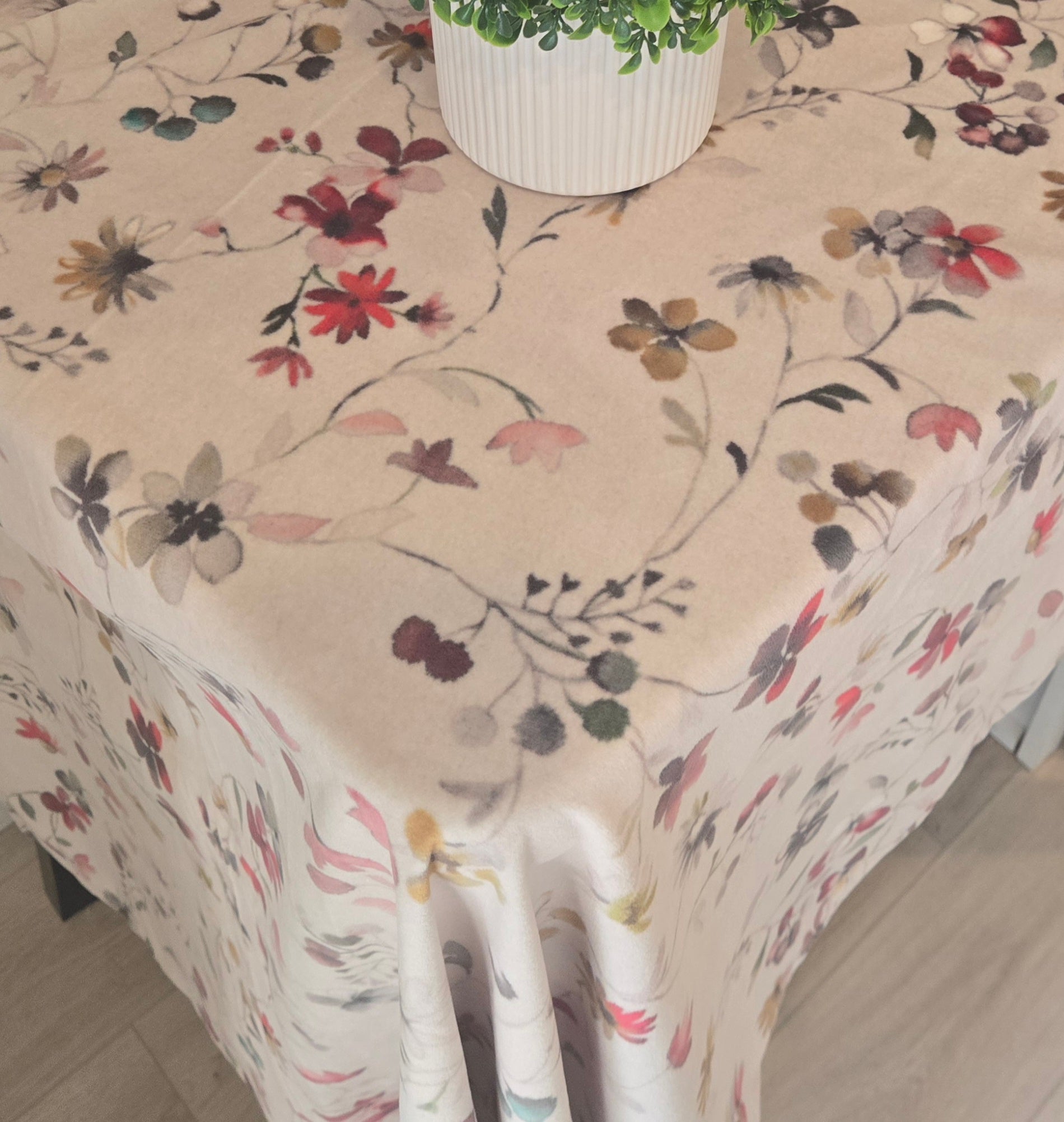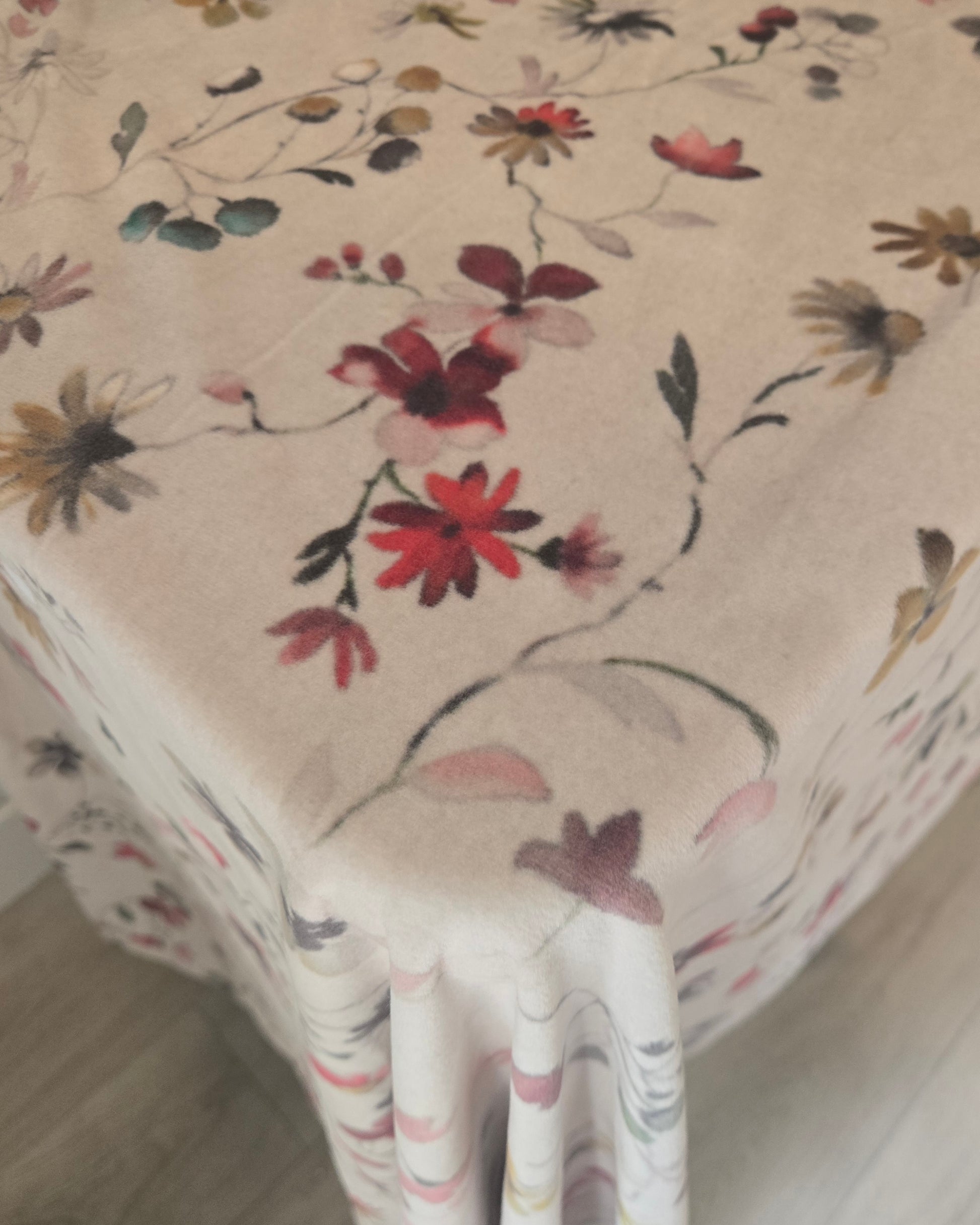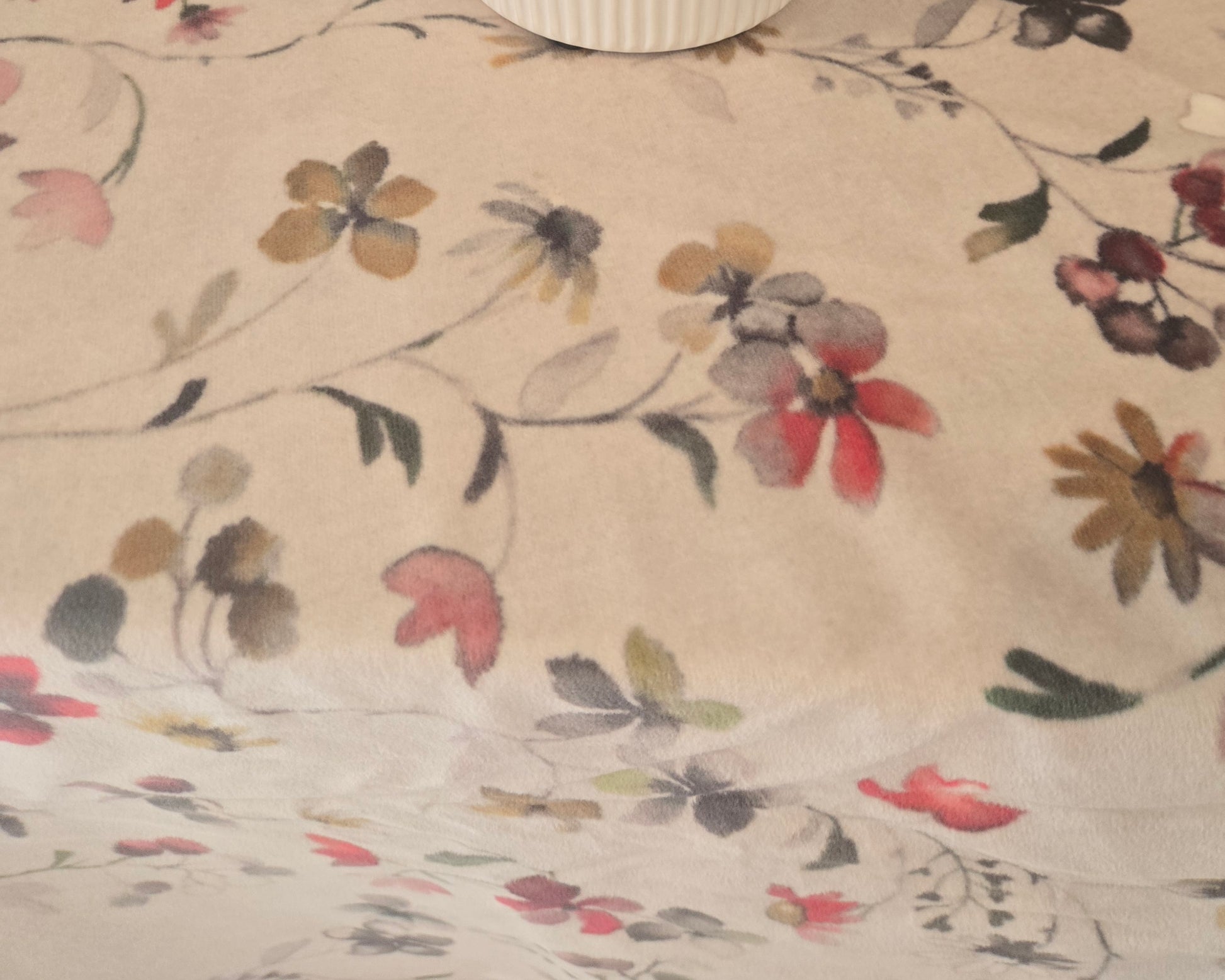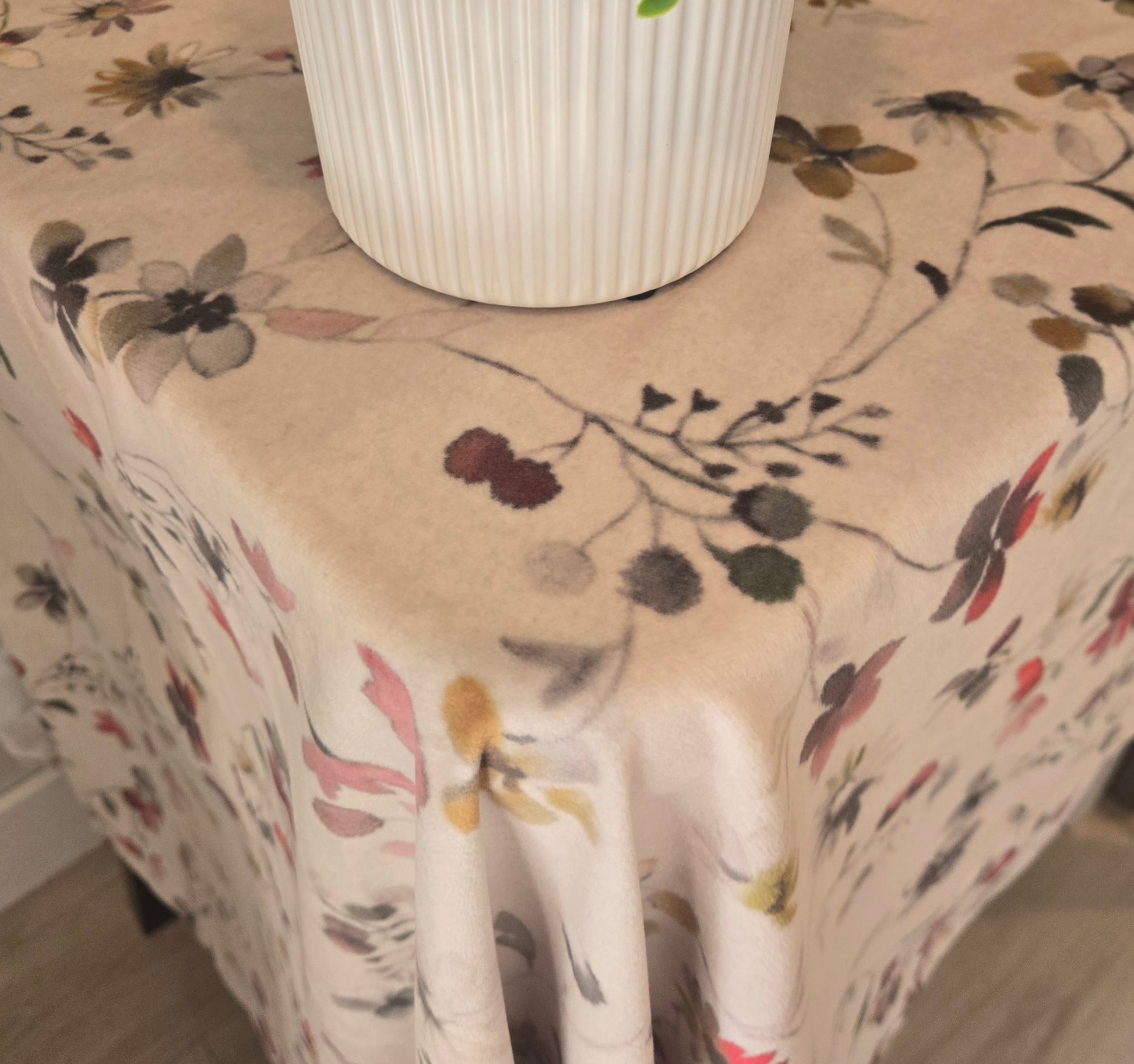 Luxurious floral velvet tablecloth, where muted watercolor tones bloom softly across a taupe backdrop